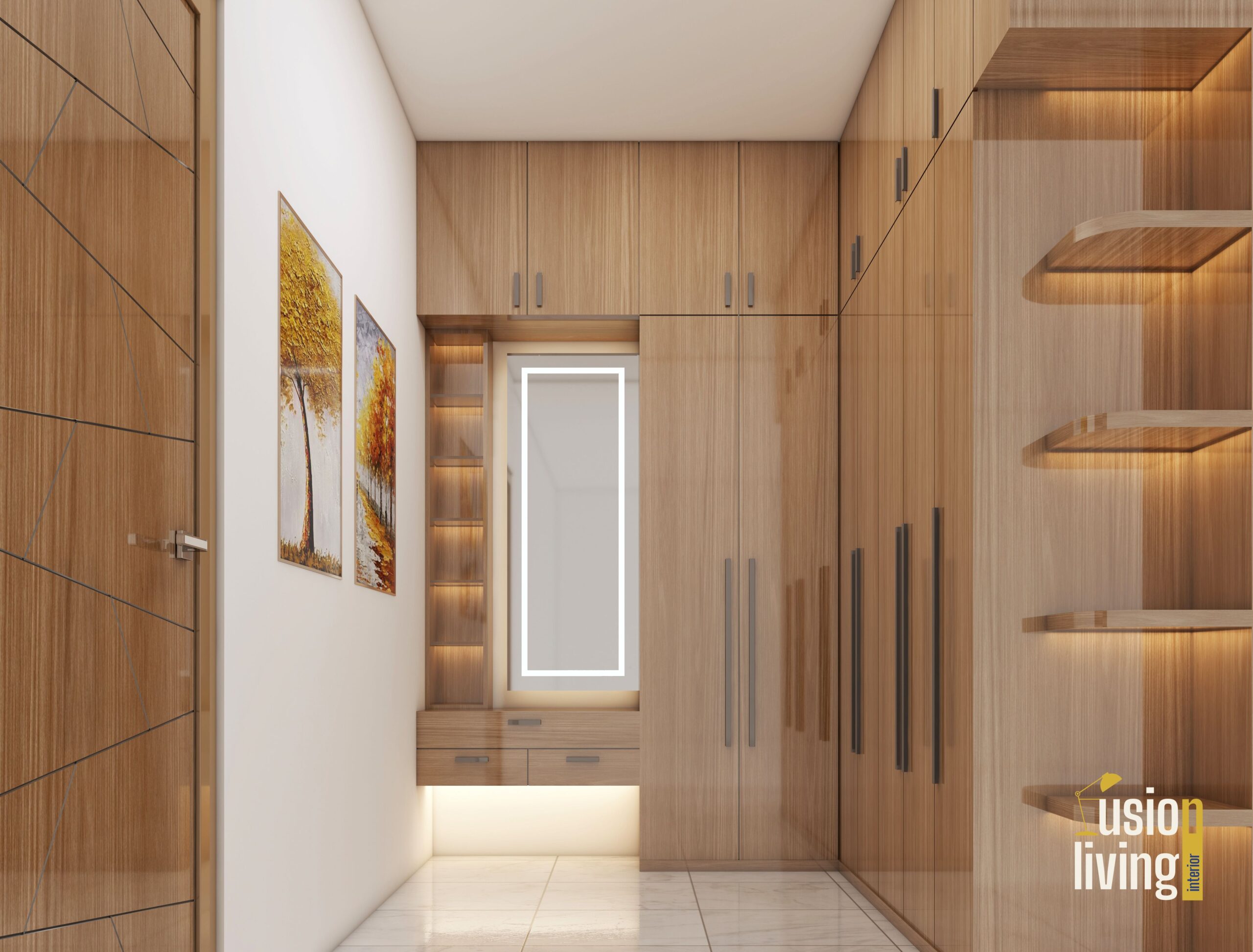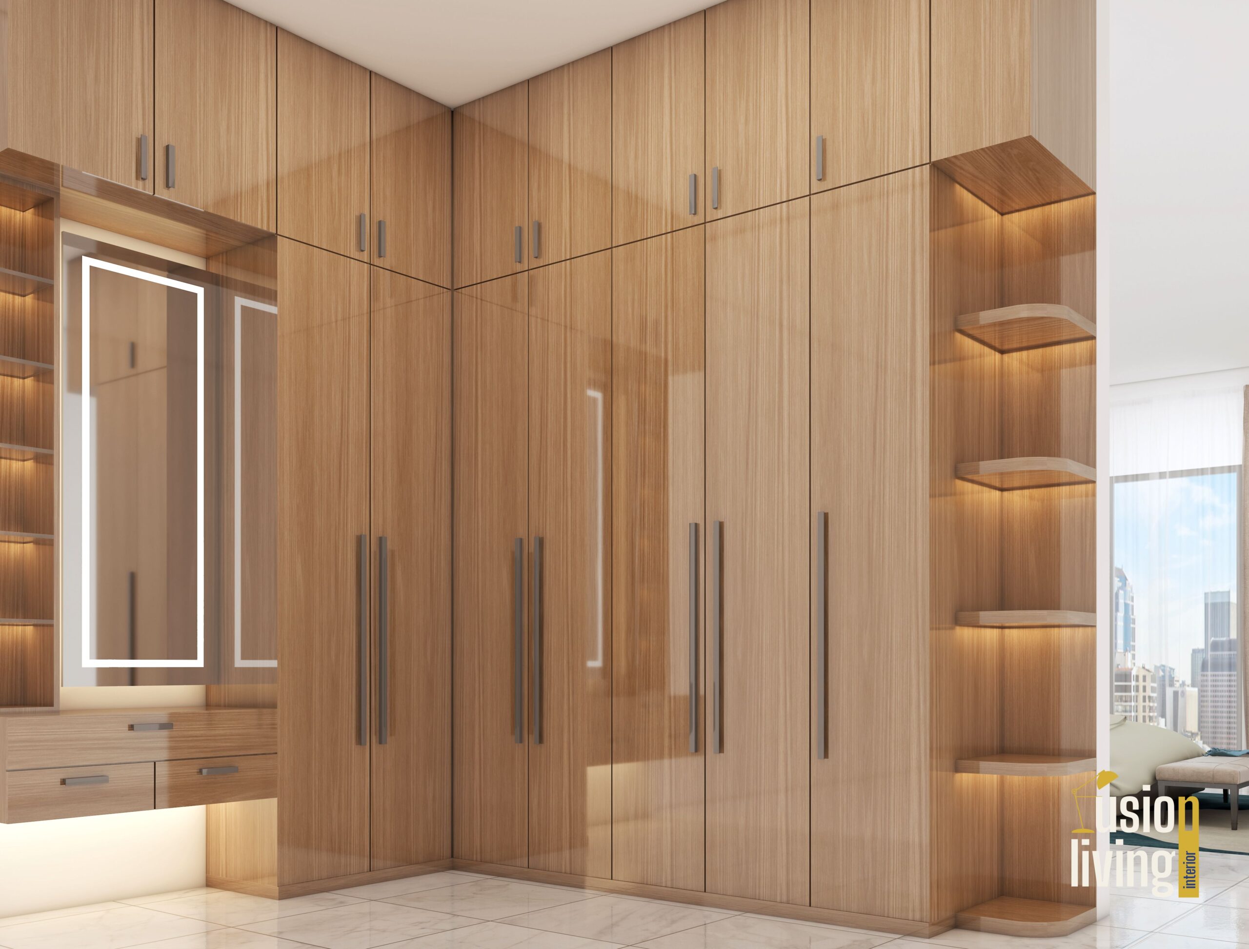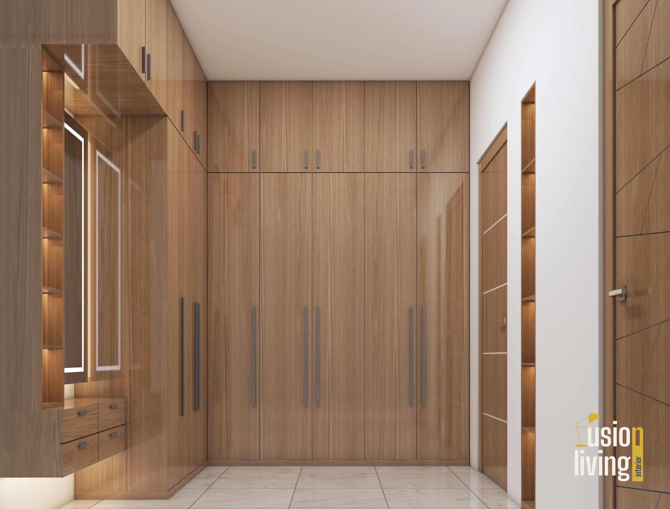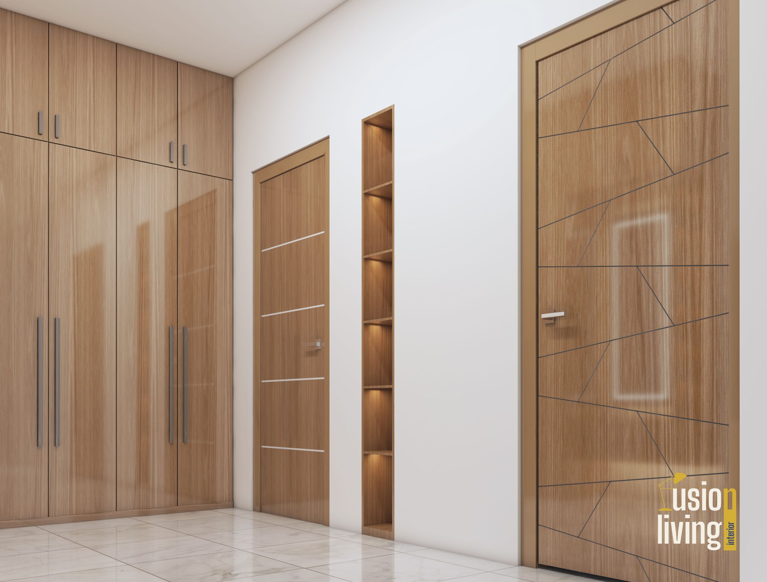 Bathrooms: Book-matched marble slabs with integrated LED-lit niches