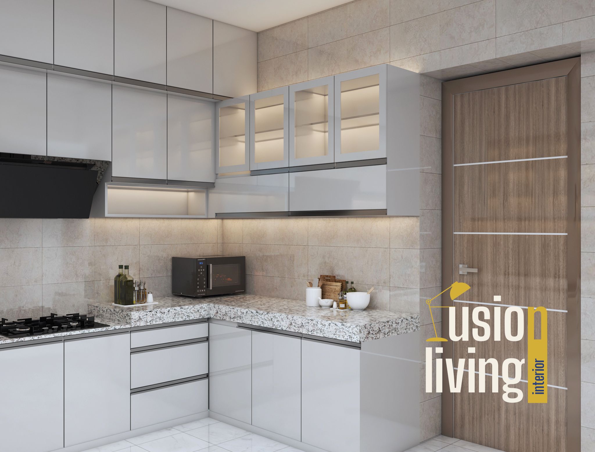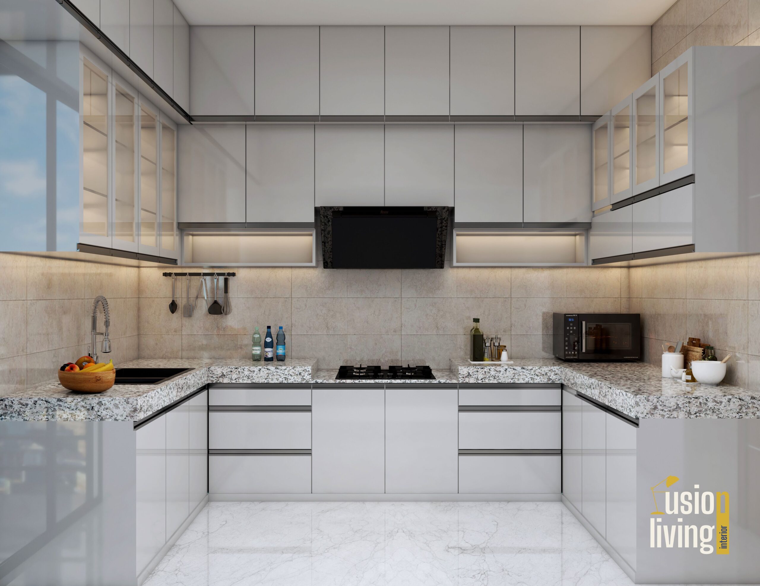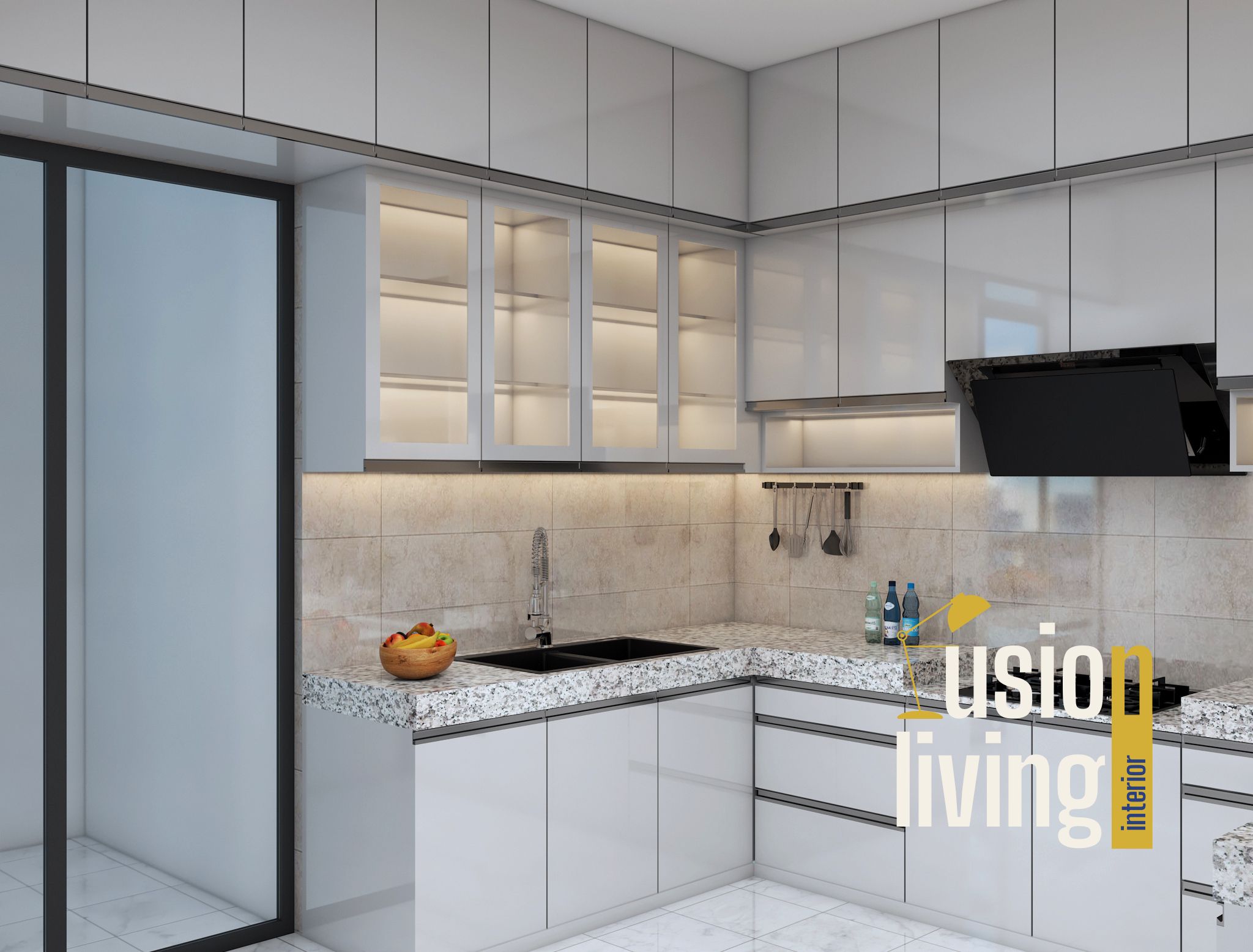 Kitchen: Custom lacquered cabinetry with fluted glass upper units