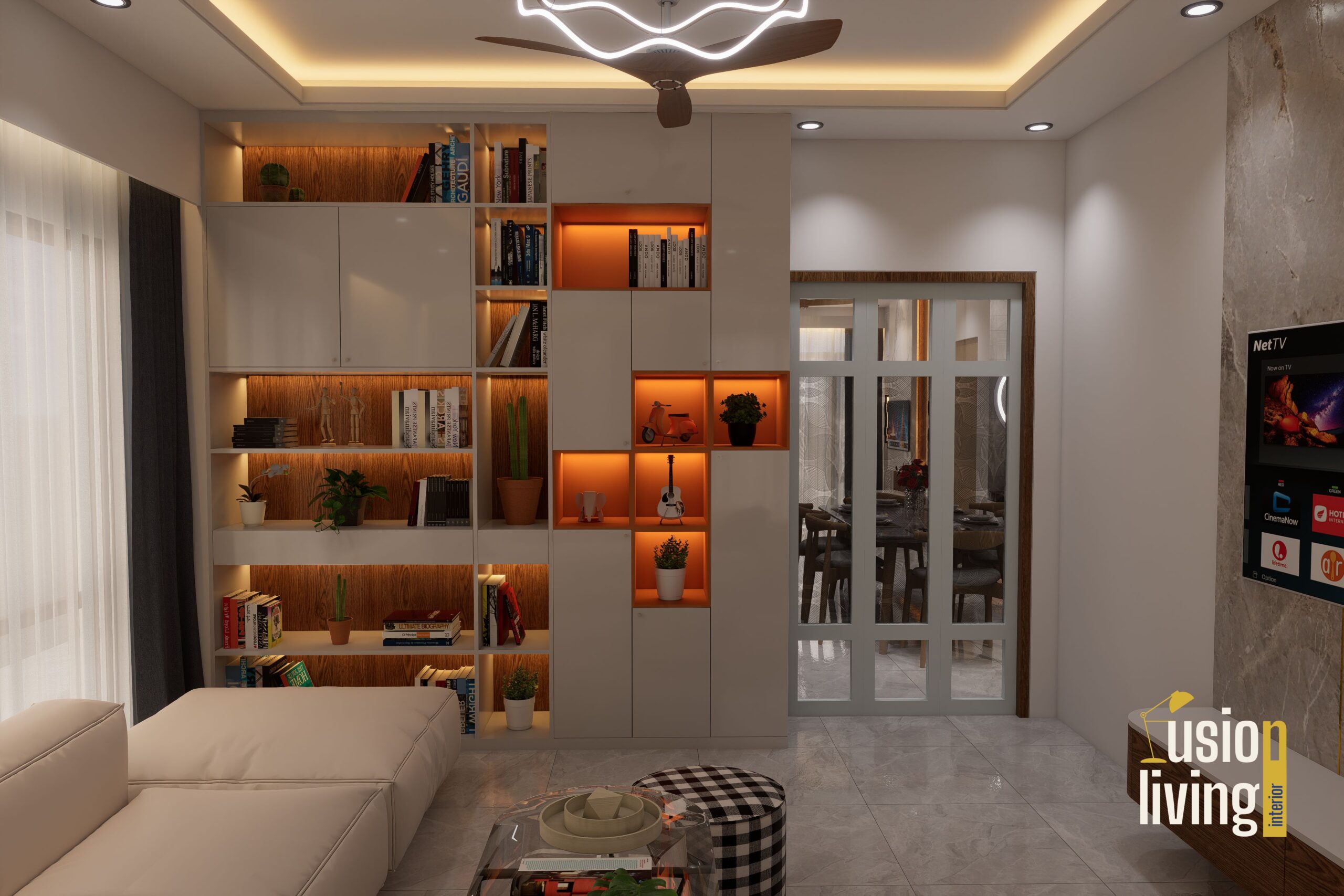 Multifunctional Media Wall: Combining display shelves, hidden storage, and integrated lighting in a sculptural composition