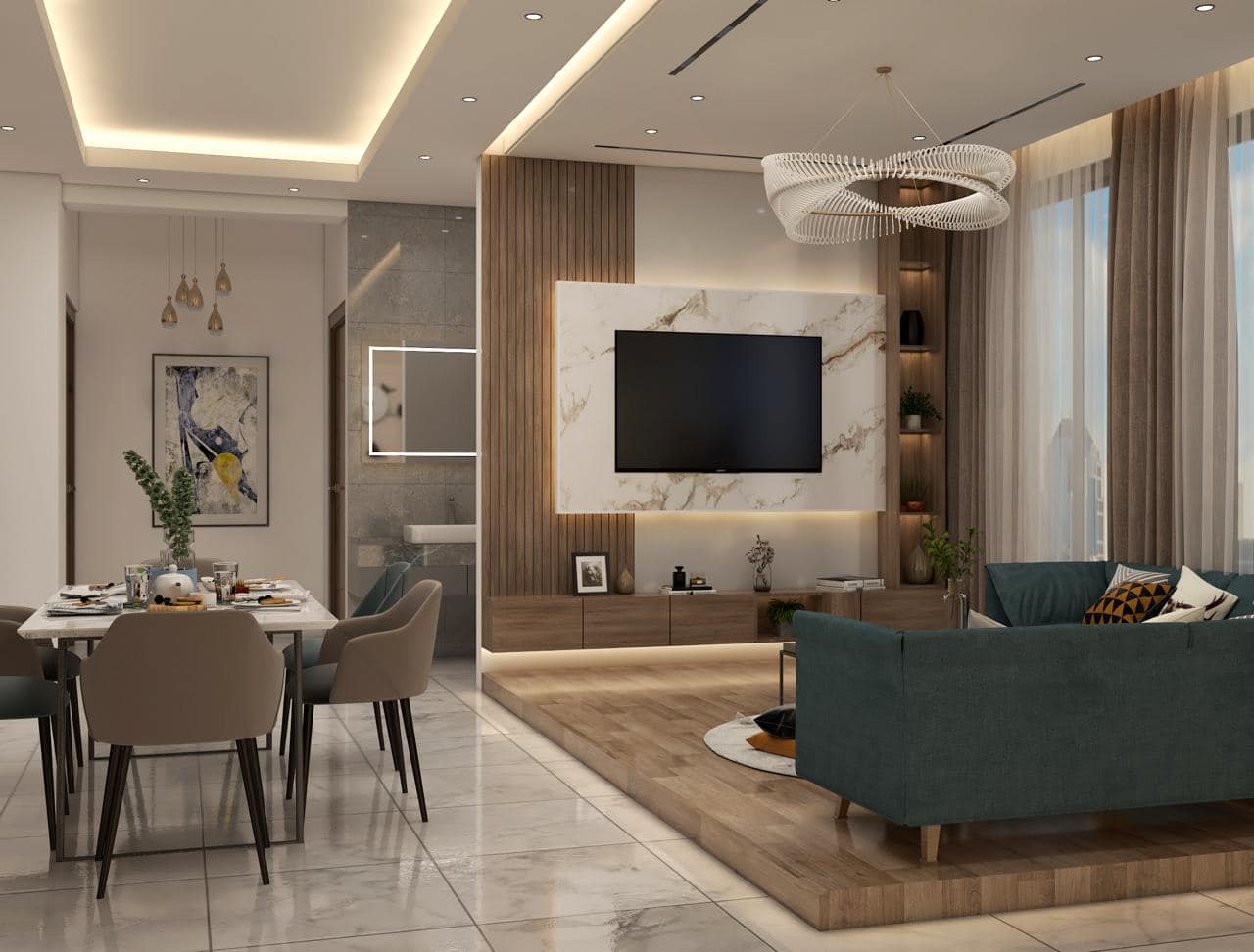 Modern false ceiling, mood lighting, and smart lighting integration for ambience and efficiency.